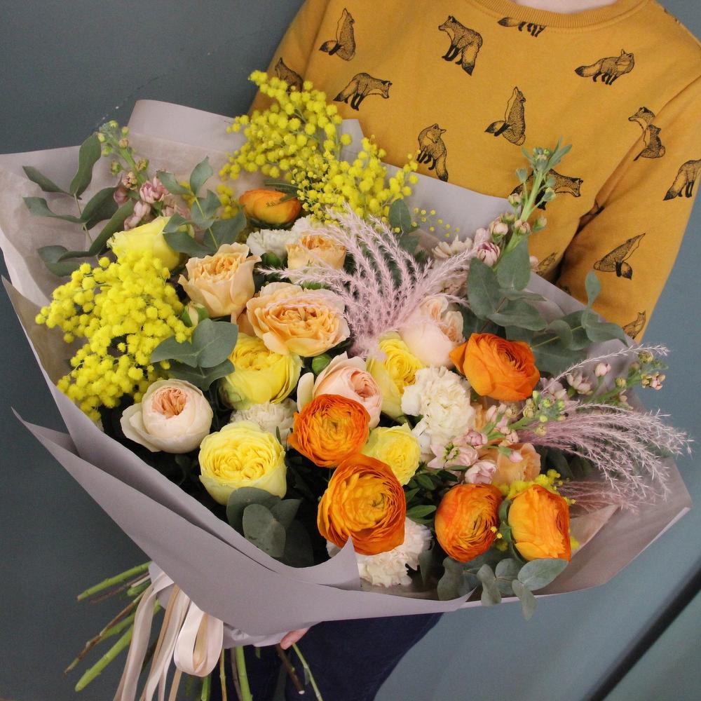 Сухоцветы – 2 шт.Роза кустовая пионовидная – 3 шт.Роза пионовидная – 7 шт.Маттиола – 3 шт.Ранункулюс – 5 шт.Диантус – 5 шт.Эвкалипт – 5 шт.Фисташка – 3 шт.Лента атласная – 3 шт.Упаковка дизайнерская – 3 шт.Мимоза – 2 шт.