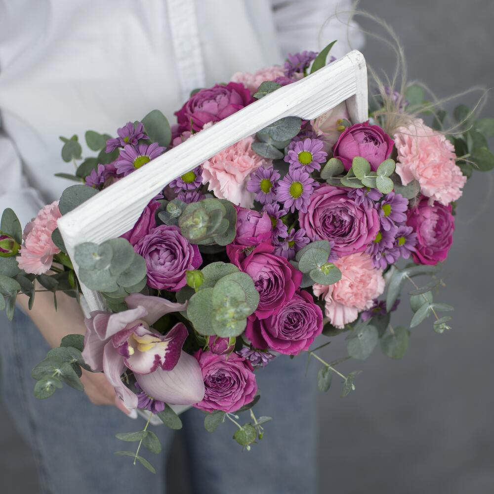 орхидея на удлинителе – 1 шт.Диантус – 5 шт.Сантини – 4 шт.Роза кустовая – 3 шт.пеннисетум – 1 шт.Альстромерия – 1 шт.Ящик – 1 шт.