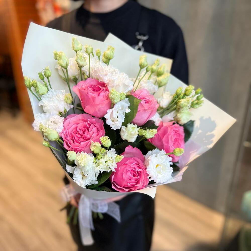 Роза розовая Эквадор – 5 шт.Эустома – 4 шт.