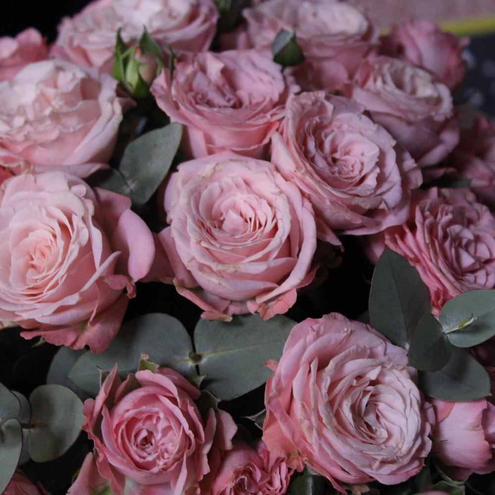 Роза кустовая пионовидная – 9 шт.Эвкалипт – 3 шт.Тишью – 2 шт.Оазис флористический – 1 шт.Шляпная коробка – 1 шт.Лента атласная – 2 шт.