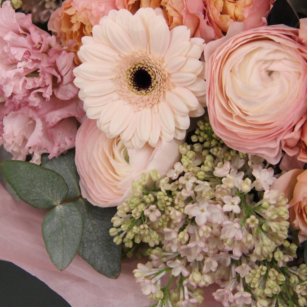 Лизиантус – 3 шт.Гербера – 5 шт.Роза кустовая пионовидная – 4 шт.Эвкалипт – 9 шт.Упаковка дизайнерская – 2 шт.Пион – 5 шт.Упаковка – 1 шт.Ранункулюс – 5 шт.