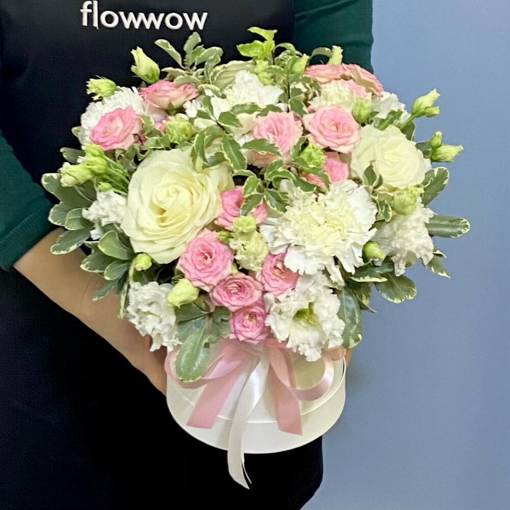 Роза белая премиум – 3 шт.Эустома – 4 шт.Диантус белый – 5 шт.Роза кустовая розовая – 4 шт.Питтоспорум – 3 шт.Шляпная коробка с лентами – 1 шт.