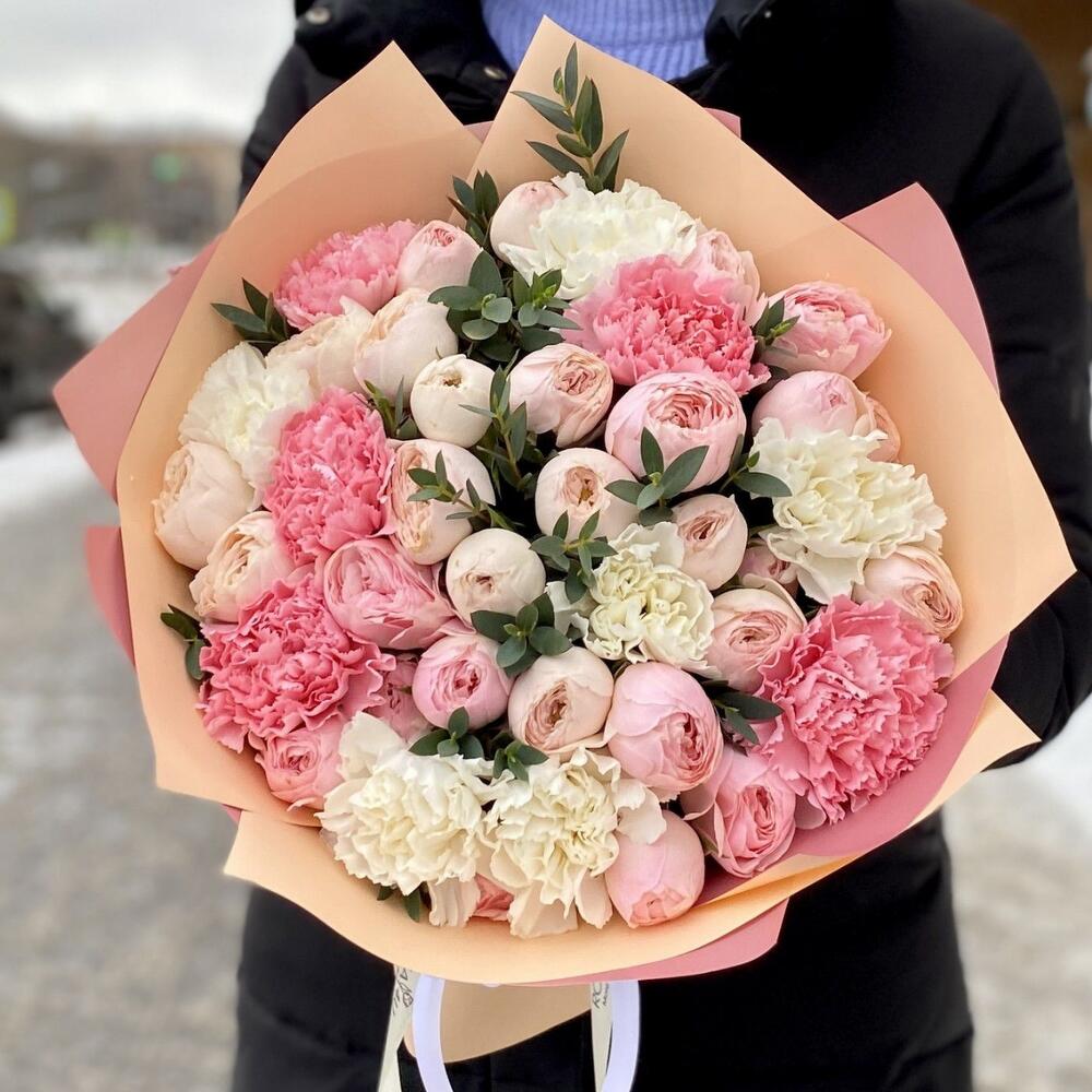 Гвоздики, Кустовые розы, Лизиантусы, Пионовидные розы, Розы