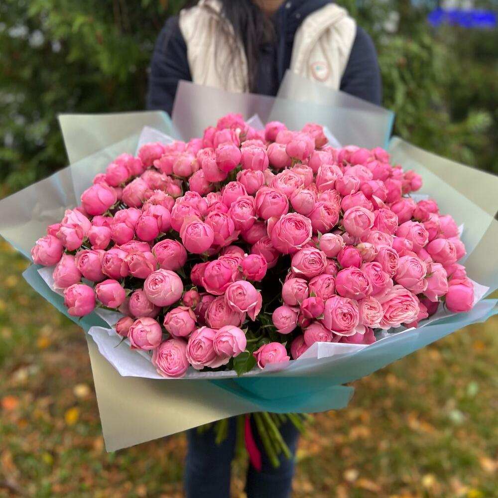 Шикарный букет из кустовой пион розы. Это прекрасный ярко розовый цветок, с прекрасным раскрытием. Розы после раскрытия напоминают пион, по этому и получили название пионовидные розы. Если доставка вам нужна срочно, то напишите нашим менеджерам и мы отправим букет максимально быстро .