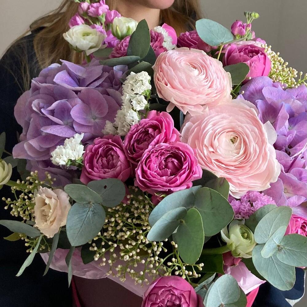 Садовая композиция в шляпной коробке с гортензиями, ранункулюсами, кустовыми пионовидными розам, душистой маттиолой, и эвкалиптом.