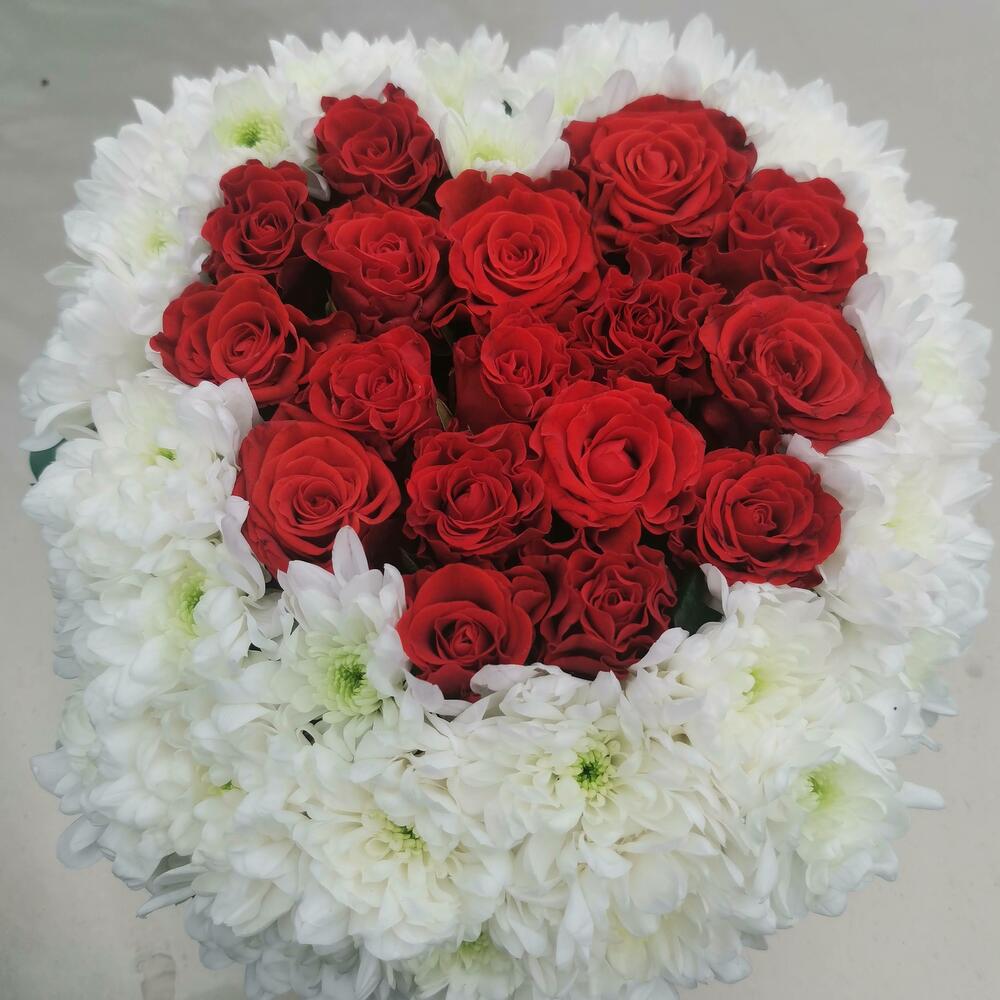 Яркое сердце из 17 красных роз и 4 веток белоснежной хризантемы. Очень нежный и привлекательный букет в форме сердца.