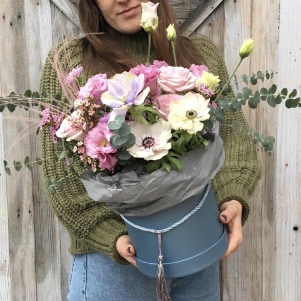 Шляпная коробка с анемонами, розами, лизиантусом, ваксфлауэром, ковылем и эвкалиптом.
