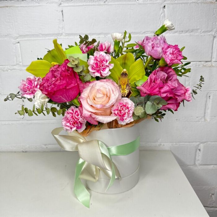 Роза Эквадор – 3 шт.Орхидея Цимбидиум – 2 шт.Диантус кустовой – 5 шт.Эвкалипт – 5 шт.Фисташка – 3 шт.Оазис флористический – 1 шт.Шляпная коробка – 1 шт.