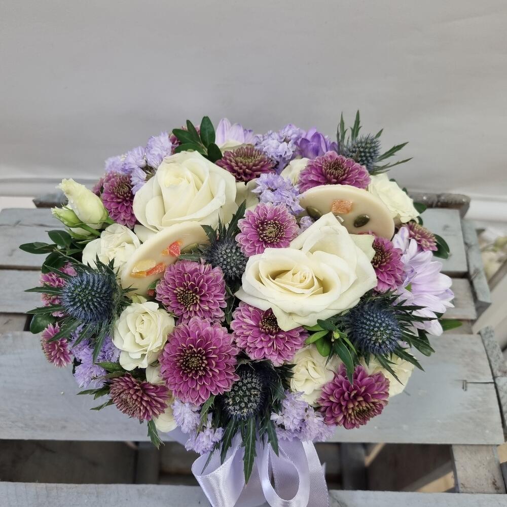 Нежная композиция в коробке с шоколадными медиантами ручной работы