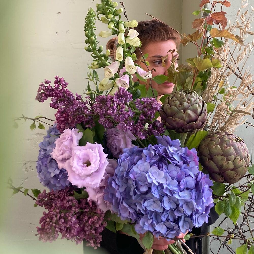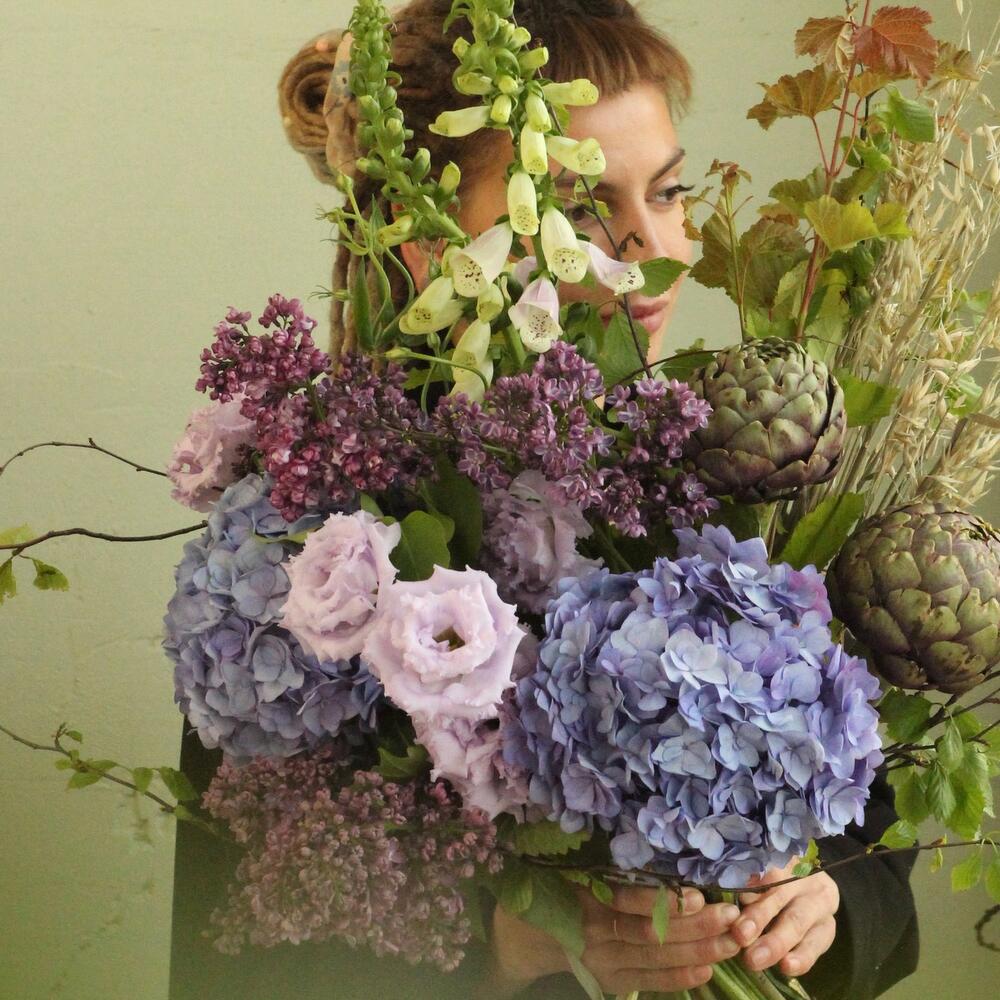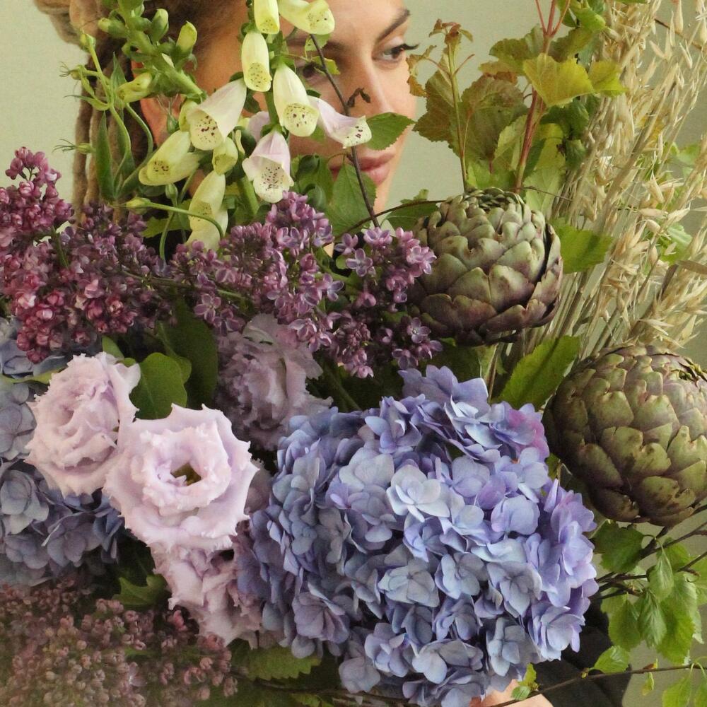 Черничный букет с гортензиями, артишоками, овсом, лизиантусом и наперстянкой.Стильное цветочное решение для любого случая.