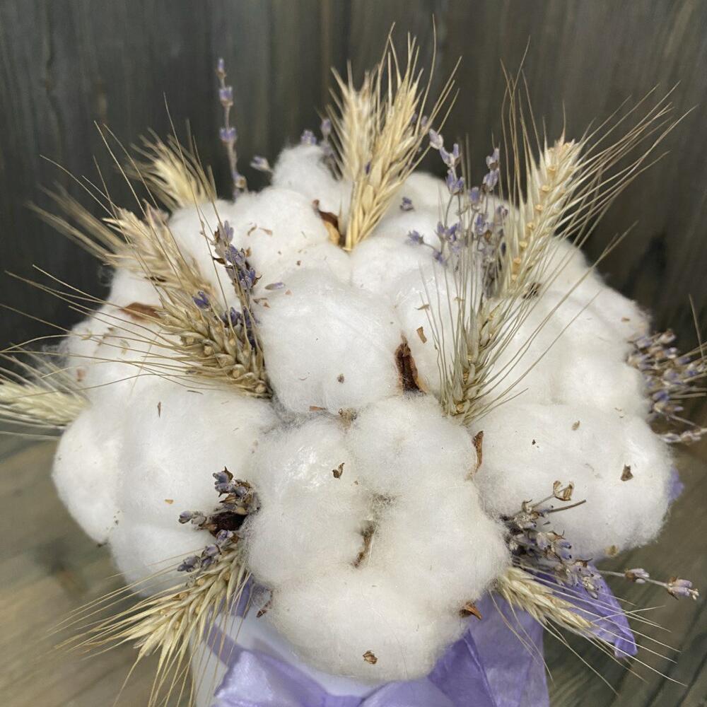 «Лавандовое созвездие» Букет из розы, гвоздики, статица и хлопка