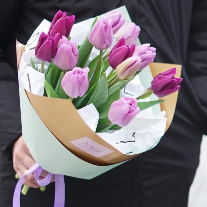 Тюльпан – 13 шт. Дизайнерская упаковка – 13 шт. Открыточка с вашими пожеланиями – 1 шт. инструкция по уходу за цветами – 1 шт.
